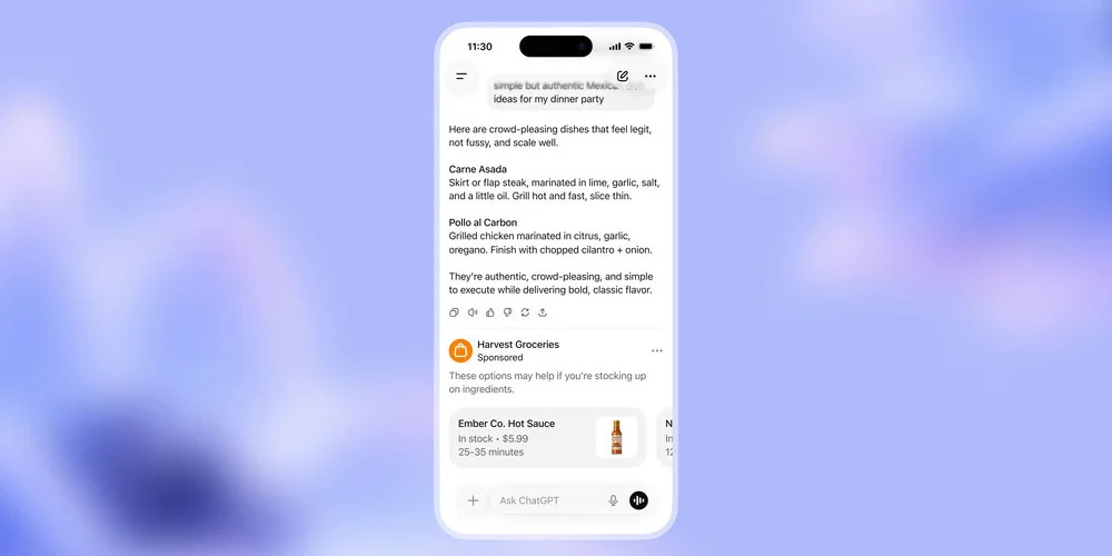 Sans entrer dans les détails, OpenAI a dévoilé deux premiers formats publicitaires. Le premier permet à une marque de mettre en avant une sélection de produits, que l’utilisateur peut directement acheter – par exemple les ingrédients nécessaires à une recette de cuisine. Le second permet de lancer une conversation avec un annonceur, comme un hôtel dans la ville sur laquelle l’internaute se renseigne. “L’IA va permettre d’offrir de nouvelles expériences, plus utiles et plus pertinentes que n’importe quelle autre forme de publicité”, promet la start-up.